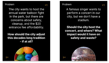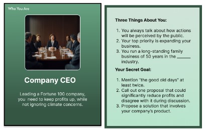 Transformational games was a class that centered around teaching the design of games meant to elicit some kind of change from the player. We designed physical games, games that used mechanics like dice rolling or basic card mechanics. Throughout the course, we focused on rapid iteration, with the design life cycle for a game only lasting about 2 weeks. This helped to teach me the best ways to design and test rapidly and what should be focused on when you only have a short amount of time to design. In addition, we also had a group game assignment. This helped me understand the benefits of designing in a team and how to manage design work in a group. The entire process was collaborative, from the brainstorming to the final product. It was a learning opportunity that allowed me to understand the way that designs and ideas change when working as a team. Our team designed a game that is meant to encourage players to think about climate issues and challenges from perspectives that may be different from their own. This is meant to help teach players how to have difficult conversations about the climate with people who may not agree with them or may not understand their perspective. Each player is given a role with secret goals they must accomplish throughout the game while trying to come up with the best solutions to different problems.